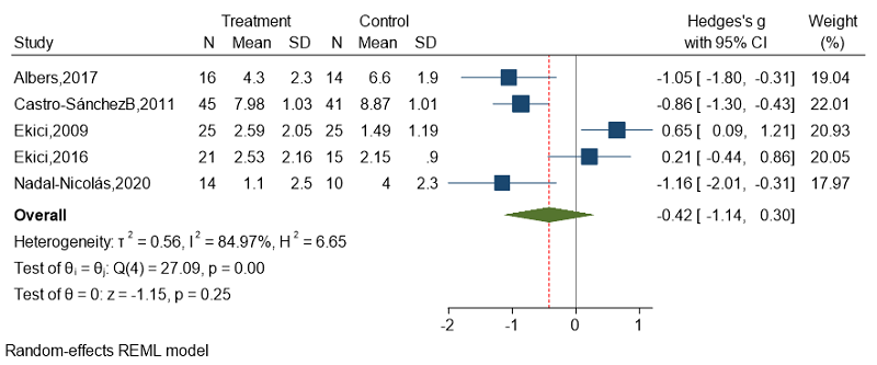 Nueve estudios evaluaron el dolor. Sin embargo, solo cinco reportaron los datos necesarios para realizar el MA [40,43,46,47,49]. Tres estudios demostraron DM con resultados a favor de la TM [40,43,49]. Un estudio demostró DM con resultados a favor del grupo control [46] y un estudio presentó DM sin diferencias significativas entre los grupos [47]. El tamaño del efecto global fue bajo y demuestra una DME general sin diferencias significativas entre los grupos al final del tratamiento (DME = - 0.42, IC al 95% = - 1.14 a 0.30, p = 0.25), con una heterogeneidad considerable estadísticamente significativa (I2 = 85%, Q = 27.09, p = <0.0001). Este resultado se presenta en la Figura 4.