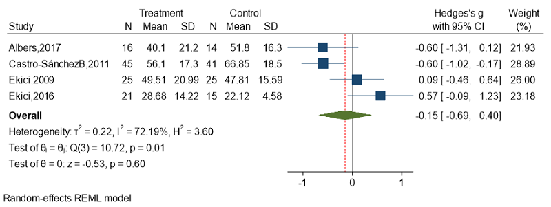 Siete estudios evaluaron el estado de salud. Sin embargo, solo cuatro estudios reportaron los datos necesarios para realizar el metaanálisis con la escala Fibromyalgia Impact Questionnare (FIQ) [40,43,46,47]. Un estudio demostró DM a favor del grupo de TM [42], mientras que los otros tres estudios demostraron una DM sin diferencias significativas entre los grupos [40,46,47]. El tamaño del efecto global fue insignificante y reportó una DME sin diferencias significativas entre los grupos al final del tratamiento (DME = -0.15, IC al 95% = -0.69 a 0.40, p = 0.60), con una heterogeneidad considerable estadísticamente significativa (I2 = 79%, Q = 10.72, p = 0.01). Este resultado se presenta en la Figura 5.