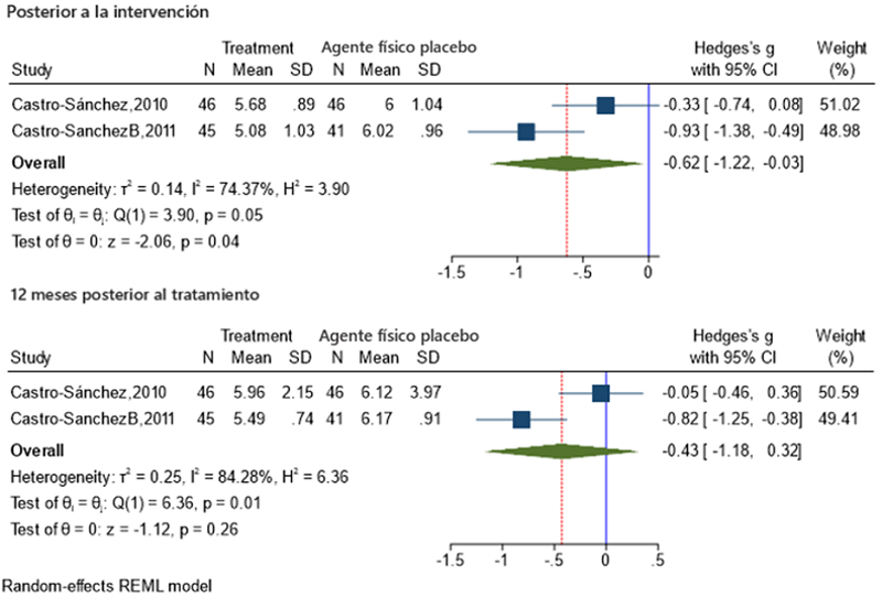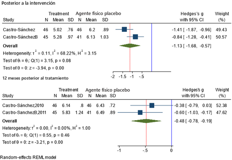 Resultados: Once estudios cumplieron con los criterios de selección y seis fueron incluidos en una síntesis cuantitativa. El dolor al terminar el tratamiento tuvo una diferencia de medias de -0.42 (IC al 95% -1.14, 0.30, p = 0.25), el estado funcional al terminar el tratamiento tuvo una diferencia de medias de -0.15 (IC al 95% -0.69, 0.40, p = 0.60), la impresión global de salud al terminar el tratamiento tuvo una diferencia de media de -1.13 (IC al 95% -1.68, -0.57 p = <0.00) y posterior a doce meses una diferencia de media de -0.48 (IC al 95% -0.78, -0.19 p = <0.00), la impresión global de severidad después de la intervención tuvo una diferencia de medias de -0.62 (IC al 95% -1.22, -0.03, p = 0.04) y posterior a doce meses una diferencia de medias de -0.43 (IC al 95% -1.18, 0.32, p = 0.26).
