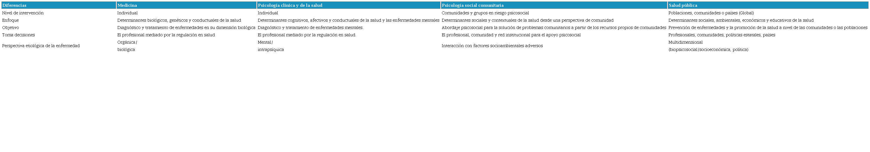 En este sentido, los enfoques médicos y psicológicos centrados en los individuos y las comunidades integran diferentes áreas de la salud pública. Sin embargo, lo público como dimensión política, estatal y colectiva es propio del campo de la salud pública, su objeto y su quehacer. Así, la noción de lo público en la salud es el principal diferenciador con disciplinas y enfoques propios de la psicología y la medicina. A pesar de las similitudes y vínculos colaborativos en el quehacer de la salud pública, la psicología y la medicina, también existen grandes diferencias. La Tabla 1 muestra algunas de las diferencias más relevantes.