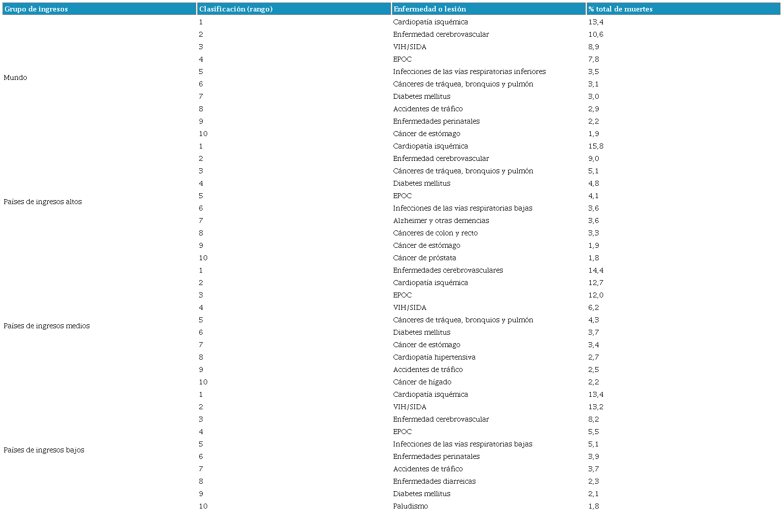 Estas funciones esenciales propuestas por la OPS [68] deben fortalecer las capacidades de la salud pública para dar respuesta a los desafíos clave del siglo xxi, especialmente a los factores que representan un mayor riesgo de mortalidad y morbilidad en la población mundial y en las regiones. Al respecto, Mathers y Loncar [39] estimaron diferentes modelos predictivos de la mortalidad y la carga de enfermedad para el 2030 a partir de los datos de la OMS. Los hallazgos muestran que para el 2030 se prevé que el riesgo de muerte de niños menores de cinco años se reduzca en casi un 50 %, la proporción de muertes por enfermedades no transmisibles aumente del 59% en 2002 al 69% en 2030, las muertes por VIH/SIDA aumenten de 2,8 millones en 2002 a 6,5 millones en 2030. Se proyecta que el total de muertes atribuibles al tabaco aumente de 5,4 millones en el 2005 a 6,4 millones en 2015 y 8,3 millones en 2030 y será responsable del 10% del total de muertes a nivel mundial. Se prevé que las tres principales causas de la carga de morbilidad en 2030 incluyan el VIH/SIDA, los trastornos depresivos unipolares y la cardiopatía isquémica [39,40]. La Tabla 2 muestra la clasificación de las 15 principales causas de muerte para el 2030 en el ámbito mundial y en países de ingresos altos, medios y bajos.