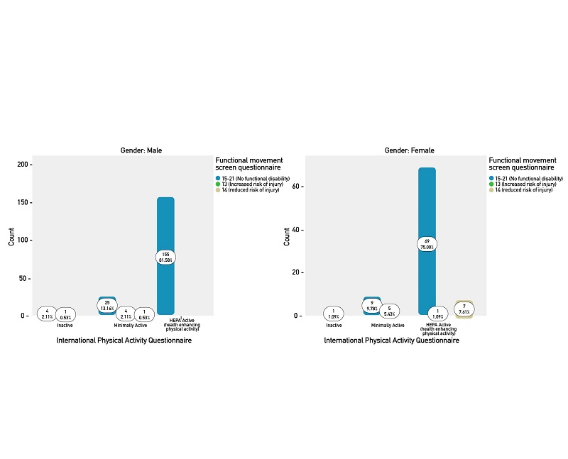 Lastly, bar chart illustrates the relationships between physical activity levels, functional movement quality, and cardiovascular fitness across male and female participants. In Figure 1, the majority of both males (87.4%) and females (89.1%) were classified as HEPA Active. Among this group, 81.6% of males and 75% of females demonstrated No Functional Disability, as indicated by their Functional Movement Screen (FMS) scores. A smaller proportion of participants in both groups showed Increased or Reduced Risk of Injury, with minimally active individuals also displaying relatively good movement quality. Inactive participants, a small fraction in both genders, still exhibited No Functional Disability.