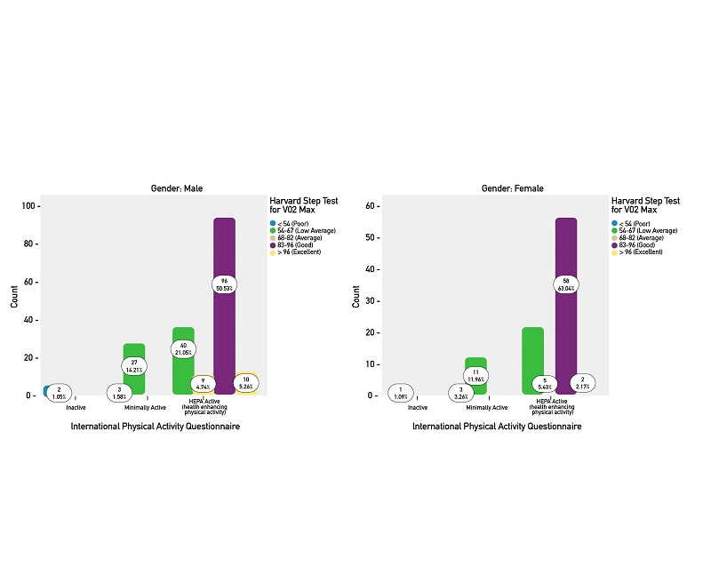 In Figure 2, cardiovascular fitness, measured by the Harvard Step Test for VO2 Max, was strongly associated with physical activity levels. The majority of HEPA Active males (83.2%) and females (79.3%) achieved Good fitness levels (VO2 Max 83-96). However, a notable percentage of both genders showed Low Average fitness (VO2 Max 54-67), particularly within the minimally active and inactive groups. Only a few individuals achieved Excellent or Poor fitness levels.