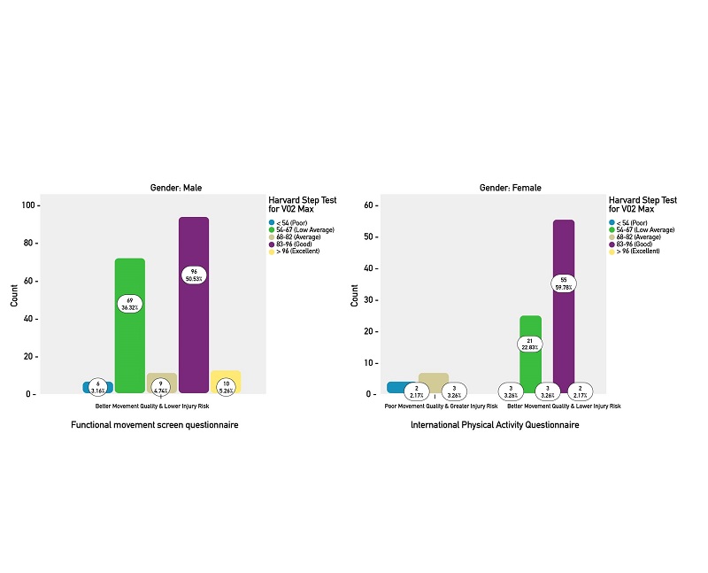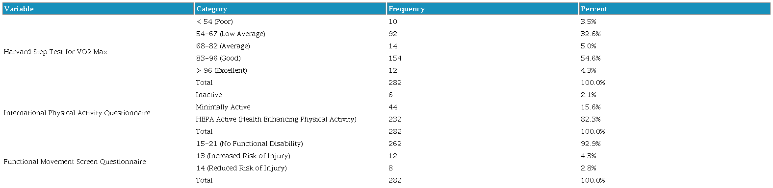 The Harvard Step Test results demonstrate that out of 282 participants, 82.62% had Low Average fitness levels, 12.06% showed Average results, and only 0.35% gained Good fitness scores. In comparison, the FMS questionnaire demonstrated that 92.91% of participants displayed No Functional Disability, only 4.26% at an Increased Risk of Injury and 2.04% at a Reduced Risk of Injury. Moreover, according to the International Physical Activity Questionnaire (IPAQ), 82.27% of individuals were HEPA Active, 15.60% were Minimally Active, and only 2.13% were Inactive [18].