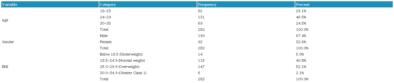 The demographic analysis of the study sample N = 282, as calculated by WHO, showed that participants were predominantly within the 24-29 age group, representing 46.5% of the total sample, followed by the 18-23 age group at 29.1% and the 30-35 age group at 24.5%. The gender distribution was skewed towards males, who comprised 67.4% of the participants, while females made up 32.6%. In terms of BMI, 52.1% of participants were classified as overweight, 40.8% had a normal BMI, 5.0% were underweight, and 2.1% fell into the Obesity Class 1 category as shown in Table 1.