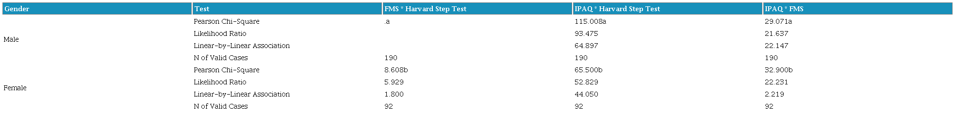 The chi-square analysis revealed gender differences in the relationships between physical fitness and movement variables. For the relationship between the FMS and the Harvard Step Test, a significant association was found only in females (Pearson Chi-Square = 8.608, p < 0.05). However, significant associations were observed for both males (Pearson Chi-Square = 115.008, p < 0.05) and females (Pearson Chi-Square = 65.500, p < 0.05) in the relationship between IPAQ and Harvard Step Test, suggesting a strong link between physical activity levels and cardiovascular fitness in both genders. Similarly, significant relationships were observed between IPAQ and FMS for both males (Pearson Chi-Square = 29.071, p < 0.05) and females (Pearson Chi-Square = 32.900, p < 0.05), indicating a strong association between physical activity levels and functional movement ability across genders as shown in Table 3.