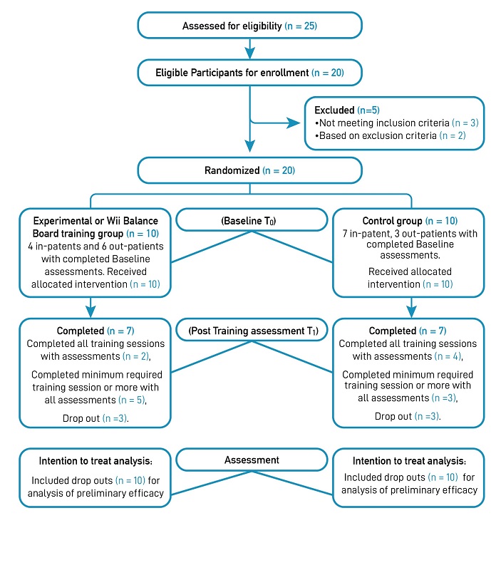 This study employed an underpowered pilot randomized control trial (parallel arm) including the experimental group (EG) or Wii Balance Board training group and a control group (CG). The structure of the pilot study assumed a 15%-20% rate of actual power calculated two-tailed sample size of 125, α = 0.05, β = 80% (1- β). The study’s participants were allotted equally (ratio of 1:1) by an independent researcher into EG and CG through a block randomization procedure (block size of 4, numerical sequence). Randomization was done using PC-based random allocation software (generated by an independent researcher who was not associated with the trial) and the computerized database concealment was followed until the intervention commenced. A blinded assessor conducted the outcome assessment, unaware of the original group allocation. The study adheres to CONSORT 2010 guidelines to report a pilot and feasibility trial [24].