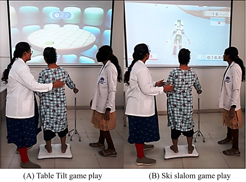The experimental intervention was conducted at the Department of Physical Medicine & Rehabilitation (SRM MCH&RC). The participants in the EG received virtual reality-oriented Nintendo® Wii Fit Plus standing balance training on the Wii Balance Board, connected to a projector screen (Figure 2). At the beginning, the vital signs, including blood pressure, pulse rate, respiratory rate, and SPO2 of the participants were monitored to confirm their hemodynamic status before and after each training session to estimate any unexpected rise in stress level and for predicting any harmful cardiovascular events [25]. The frequency and dosage of the training sessions were considered as follows: 6 sessions in a week for 2 weeks; a total 12 training sessions was administered. Two selected Wii Fit Plus balance games such as table tilt and ski slalom (particularly target standing balance involves multidirectional weight shifts and stabilization) were played in the training for 30 minutes (i.e., 14 minutes each game with 2 minutes of rest period in between at level-1/beginner stage). Next at level-2/advanced stage, a total of 40 minutes of session (i.e., 18 minutes of each game with 4 minutes of rest period). Finally, at level-3/pro stage, a total period of 50 minutes of session (i.e., 22 minutes of each game with 6 minutes of rest period). The increase in training levels depended on the progression of game challenges. There were 2 minutes of warm-up with active-assisted ROM exercises of the upper limb as well as the lower limb before starting training and 2 minutes of cool-down by resting on a chair after the completion of every training session. In order to ensure a comprehensive understanding of the game-play concept and game controls on the Wii Balance Board, all participants had practice sessions lasting at least 30 minutes with the selected games prior to commencing the main training. For safety concerns, our participants were given a choice of using assistive devices like a cane or walker while stepping on, standing, or playing games on the Wii board as per their requirements. However, we encouraged our participants to minimize using the assistive devices while playing games on the Wii board. We also enforced manual assistance by two therapists during the training sessions to prevent fall incidents. We did not include any other specialized physiotherapy treatments in the experimental protocol except the Wii Balance Board training.