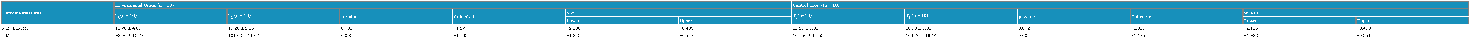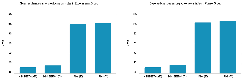 The statistical analysis was performed by the original assigned groups (both EG and CG) based on the intention-to-treat analysis principle. There were significant improvements in Mini-BESTest and FIM scores for both the experimental (EG) and control groups (CG) at post-test (T1) compared to baseline (T0). Intra-group analysis revealed large, statistically significant improvements in standing balance and functional independence for both EG (p = 0.003, 0.005; Cohen’s d = -1.277, -1.162) and CG (p = 0.002, 0.004; Cohen’s d = -1.336, -1.193) (see Table 6 and Figure 3).