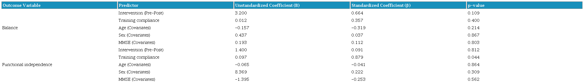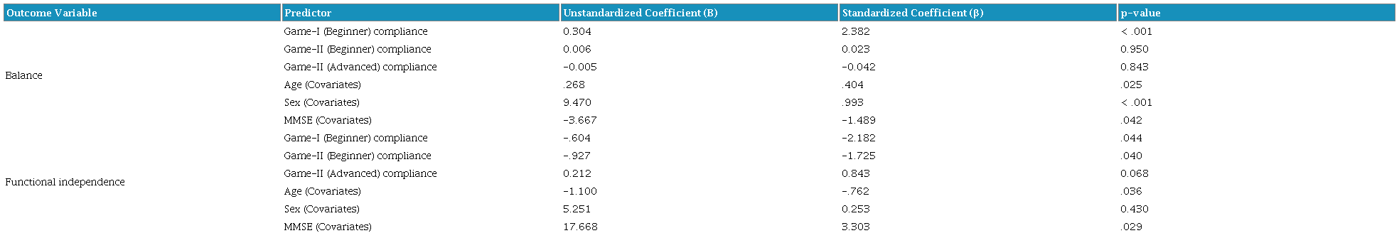 A mediation analysis in EG revealed that the exergame compliance rate (Game I & II at various difficulty levels) served as a mediator for the impact of individual participant's characteristics (age, sex, MMSE) on balance outcomes (β = 0.304, p<0.001) and functional independence measures (β = −0.604, p = 0.044, as it can be seen in Table 10.