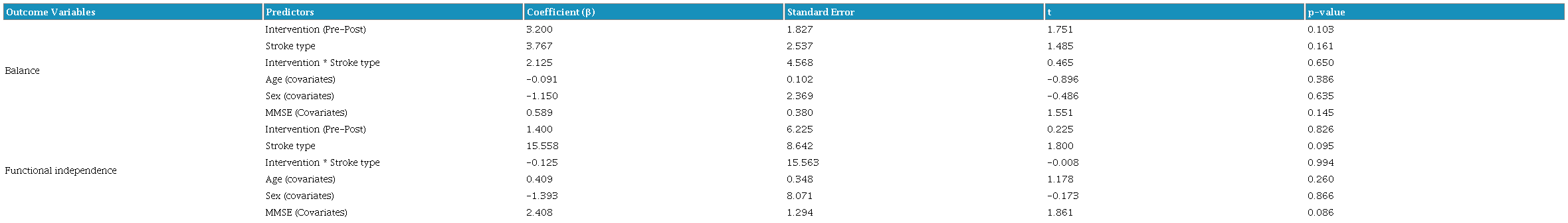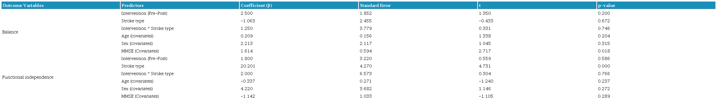 Further moderation analysis in EG using different types of stroke showed that it did not significantly predict balance outcome (β = -1.063, p = 0.672), but it did predict functional independence status (β = 20.201, p < 0.001). Though, no major moderating effect by stroke types was seen to influence the association between the exergame intervention and balance (β = 1.250, p = 0.746) or functional independence outcomes (β = 2.000, p = 0.766). Higher cognitive function as measured by MMSE was linked to improved balance (β = 1.614, p = 0.018), but not for functional independence (β = -1.142, p = 0.289), as shown in Table 9.