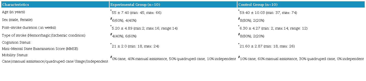 The study protocol was approved by the SRM Institutional Ethical Committee, holding the reference number SRMIEC-ST0823-695 and the study was also registered under the Clinical Trial Registry of India (ctri.nic.in) with the registration number CTRI/2023/11/059464. We assessed 25 stroke patients for the eligibility of recruitment in the hospital. Out of them, three patients did not fulfill the requirements for inclusion, and two patients were not qualified to be recruited due to meeting the criteria for exclusion. Finally, we successfully recruited a total of 20 sub-acute stroke patients who met the criteria for inclusion and exclusion. Out of the total number of recruited participants, 11 were from in-patient sources and 9 were from out-patient sources. The EG was comprised of 4 in-patients and 6 out-patients, while the control group included 7 in-patients and 3 out-patients. (Figure 1 - participants’ flow chart). Everyone signed a document indicating their voluntary consent and comprehension of the provided information.