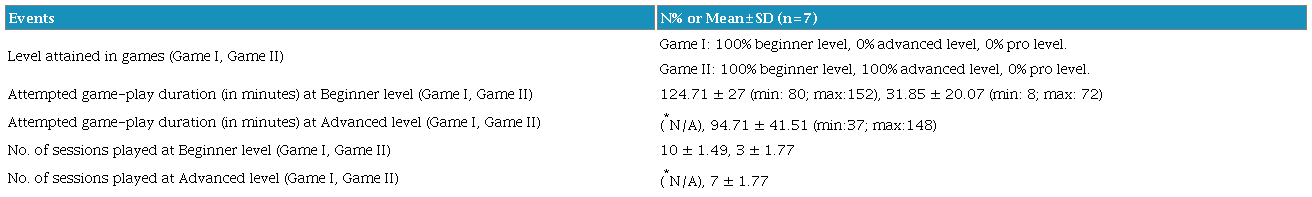 The compliance rate for the treatment in EG was found to vary based on the Exergame difficulty levels of the distinct exergames. For Game-I at the beginner level, the compliance rate was 89.07%, while for Game-II it was 75.83%. At the advanced level, Game-II received a rating of 75.16%, but no one was able to make progress in Game-I at that stage. The gameplay-related events in EG are statistically described in Table 3.