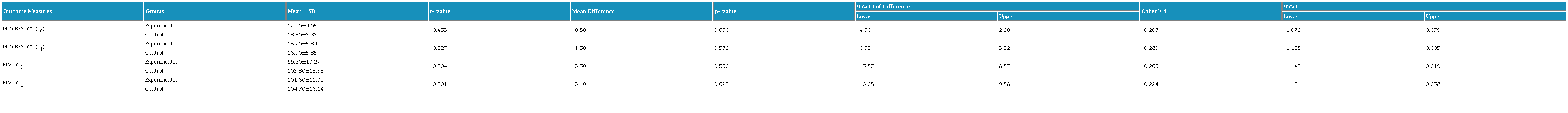 The inter-group analysis indicates that there were no significant differences in the improvement of balance control (Mini BESTest) and functional independence status (FIMs) between the EG and CG at post intervention (T1). Additionally, the treatment efficacy was found to be limited (p = 0.539, 0.622; Cohen’s d = -0.280, -0.224; 95% CI: -1.158 to 0.605, -1.101 to 0.658). The findings indicate the experimental intervention did not offer a significant benefit over the control intervention in this preliminary investigation (see Table 7).