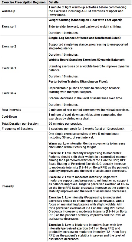 The participants in the CG got standard physiotherapy care for standing balance, which was administered as follows: exercise 1, weight shifting while standing on floor with feet apart (side to side, forward and backward); exercise 2, single-leg stance for both affected and unaffected; exercise 3, wobble board standing exercises for dynamic balance; exercise 4, perturbation training (unpredictable pushes or pulls while standing on floor). Each exercise was executed for the duration of 10 minutes (a single exercise consisted of two 5-minute bouts including 30 sec. of rest interval). Interval period was 2 minutes in between two exercises. Before commencing the training, a one-minute warm-up activity was performed and a one-minute cool-down period was planned after completion of the training session. The total treatment duration was 50-minute per session for a total of 12 training sessions, occurring 6 sessions in a week up to 2 weeks, which was administered in the Department of Physiotherapy (SRM MCH&RC). See the Control Group exercise regimen in Table 1.