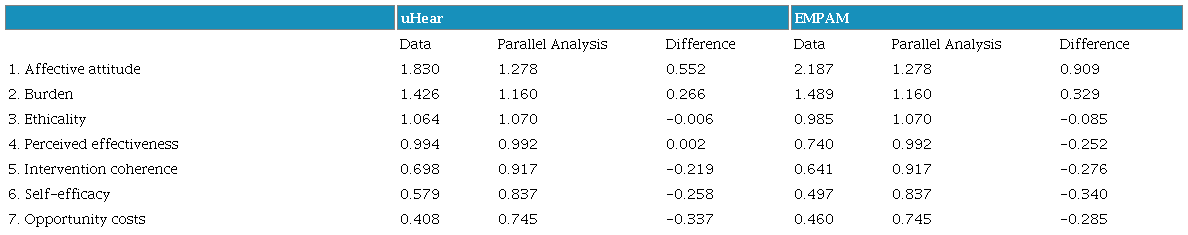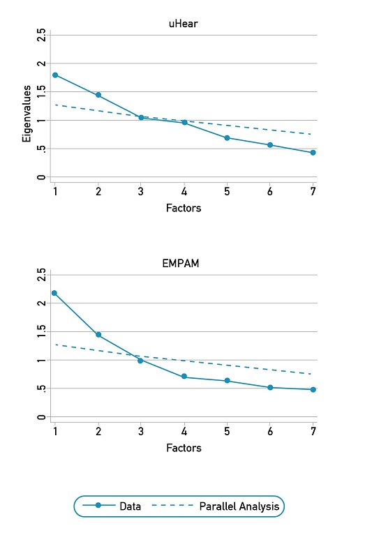In Figure 1, the result of the three analysis criteria can be observed. For uHear, three factors with eigenvalues greater than one are observed; however, both the scree plot slope and the parallel analysis suggest the presence of two factors. Regarding EMPAM, it is observable that only two factors have eigenvalues greater than 1, and both the scree plot slope analysis and the parallel analysis suggest the same. Considering that most analyses support it, the decision was made to extract two factors. The detailed results of the parallel analysis can be found in Appendix 2.