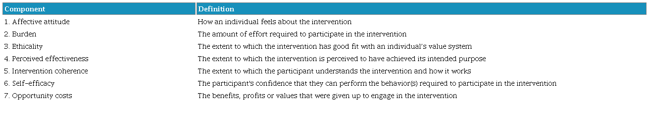 Sekhon M, Cartwright M, Francis JJ. Acceptability of healthcare interventions: An overview of reviews and development of a theoretical framework. BMC Health Serv Res [Internet]. 2017;17(1):88. doi: https://doi.org/10.1186/s12913-017-2031-8