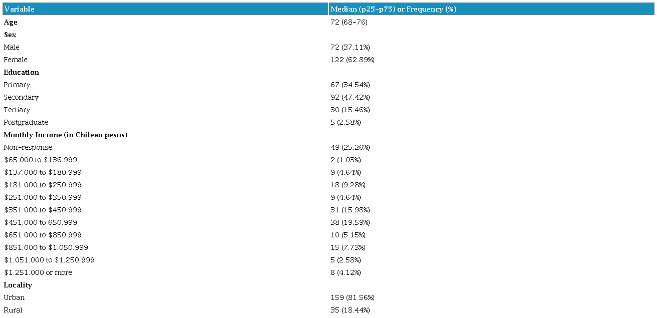 The final version of the generic TFA questionnaire was administered to a sample of 194 older adults aged between 68 and 76 years. A non-probabilistic convenience sampling was used across four primary healthcare centers (PHCs) in the Valparaíso Region, Chile. Inclusion criteria required participants to have a normal cognitive status. This was verified through scores equal to or higher than 13 points on the abbreviated version of the Mini-Mental State Examination (MMSE), a tool routinely used in Chilean PHCs for dementia screening [13]. Detailed descriptive statistics of the sample are presented in Table 3.