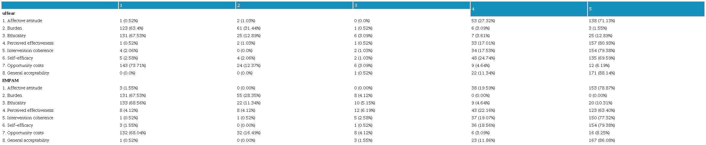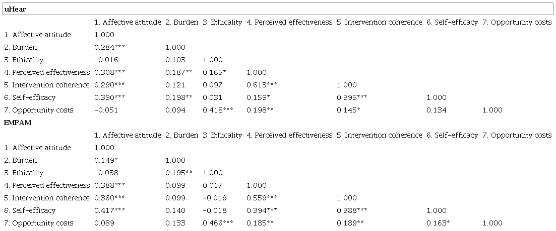 Table 4 shows the correlation matrix for the items of the generic TFA questionnaire, both for uHear and EMPAM. In both cases, significant correlations of weak to moderate magnitude were evident. The pattern of correlations was similar for both procedures. The frequency of responses for each option is presented in Appendix 1.