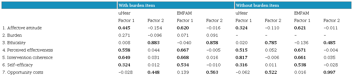 Given that the dataset violated the assumption of multivariate normality, the least squares method, known for its robustness against asymmetric distributions, was used for factor extraction. An oblique oblimin rotation was conducted for the interpretation of the factor loadings. For the uHear data, it is observable that the items for affective attitude, perceived effectiveness, intervention coherence, and self-efficacy had significant factor loadings for the first factor, while the items for ethicality and opportunity costs had significant factor loadings for the second factor. The item for burden did not have a relevant loading for any of the factors, and none of the other items had significant shared loadings for both factors. The same pattern of factor loadings was obtained for the EMPAM dataset. In Table 5, the detail of the factor loadings can be observed. For uHear, factor 1 explained 15.73%, and factor 2 explained 14.40% of the variance, and both factors had a negligible correlation of rho = 0.159. For EMPAM, factor 1 explained 22.64%, and factor 2 explained 15.13% of the variance, and both factors had a negligible correlation of rho=0.057.