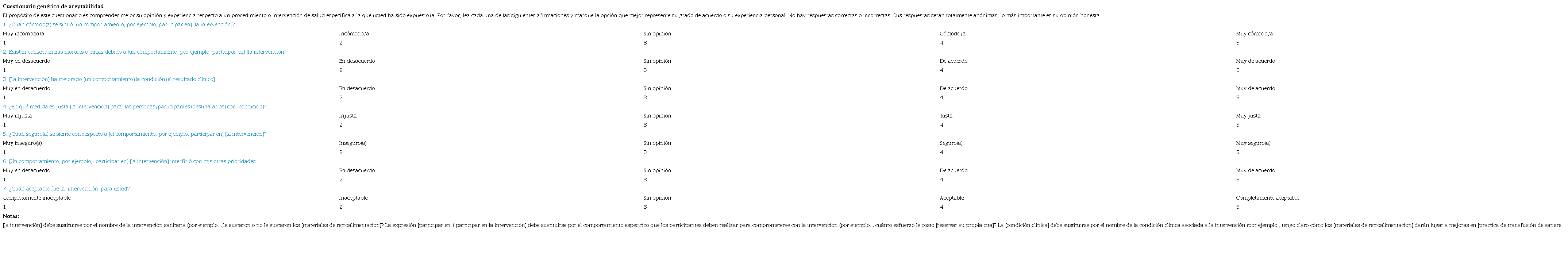 The original version of the generic TFA questionnaire includes two alternative questions for the items of affective attitude and ethicality constructs because the authors proposed to make a flexible and adaptable instrument based on the specific intervention being evaluated and the target population to ensure its comprehension. Thus, the two questions for these items can be used interchangeably [12]. However, the expert committee determined that, in Spanish, the question alternatives explore different aspects. For this reason, they referenced the respective conceptual definitions according to the TFA and proposed that the item on affective attitude should be evaluated through the question “¿Cuán cómodo(a) se sintió [un comportamiento; por ejemplo, participar en] [la intervención]?” (How comfortable were you [did you feel] with [behavior; i.e., participate in engaging with] [the intervention]?), and the ethicality item through the question “Existen consecuencias morales o éticas debido a [un comportamiento; por ejemplo, participar en] [la intervención]” (There are moral or ethical consequences due to [behavior; i.e. participate in] [the intervention]?).