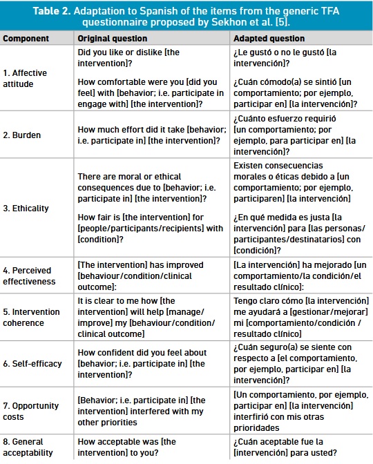 Objective: To adapt and validate the generic TFA acceptability questionnaire to Spanish.