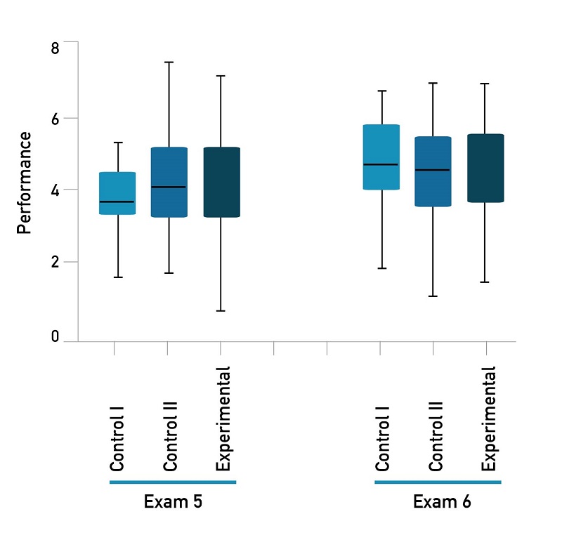 To determine the effect of the gamification strategy on academic performance, the average grades obtained were compared. Figure 3 shows that there were no significant differences between the average grades for Exam 5 (post-gamification) between the control and experimental groups (t-test, p < 0.05). Regarding the thematic unit that was not intervened, the average grade for Exam 6 (without gamification) in the experimental group was lower compared to the control group; however, this difference was not significant (t-test, p < 0.05).