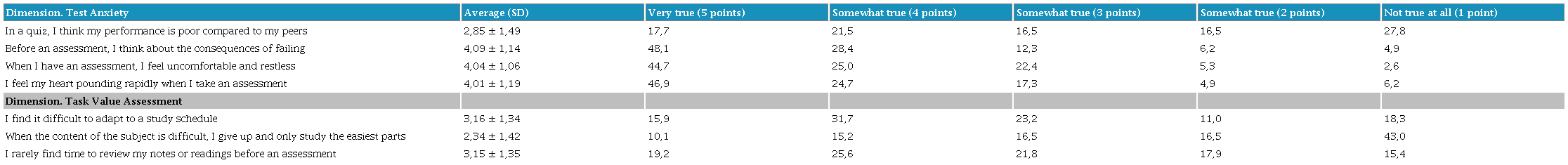 The motivation item, regarding its dimension of anxiety about exams, showed that more than 70% of students assigned a score between 4 and 5 to their levels of anxiety when taking an assessment. When observing the second dimension of the motivation factor, task appraisal, it is possible to determine that at least 45% of students have difficulties managing the time and place of study for the subject (see Table 1).