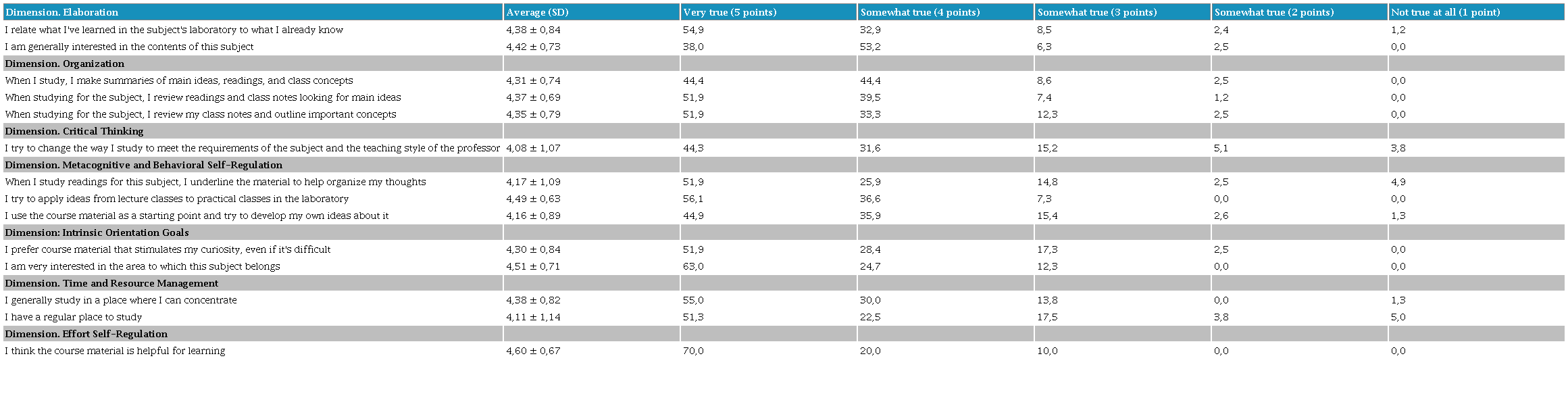 A second factor analyzed in the MSLQ-SF instrument addressed learning strategies. When observing the results derived from the elaboration dimension, over 70% of students reported applying cognitive and metacognitive strategies to learn the subject. However, 57% of participants admitted to some extent giving up studying or only studying what was easier when the content appeared more complex. The organization dimension revealed that students positively related to strategies that allow them to manage resources for studying the content, such as summarizing, taking notes, and reviewing key concepts. Regarding critical thinking, an important finding is that 75% of surveyed students modify their study methods based on the teaching style of the instructor (see Table 2). Finally, in the metacognitive and behavioral self-regulation dimension, there was homogeneity among positive average scores for statements that inquire about going back through readings, solving application activities, and using learned material as a starting point for more complex inferences on the same topic.