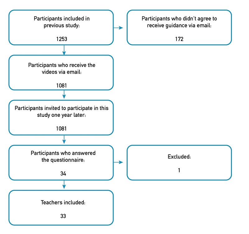 The sample comprised Brazilian teachers from various educational levels and disciplines who had participated in previous research [6] and received informational voice and communication material during the COVID-19 pandemic via email. Figure 1 presents the participants’ flowchart.