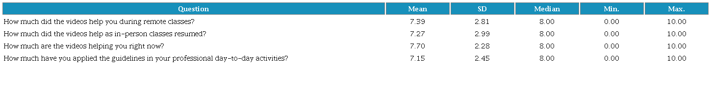 The teachers’ self-perceived effects of the videos were quite similar during different periods of the pandemic -remote classes, resuming in-person classes, and current classes- and in applying the guidelines in their daily lives. The scores were positive, demonstrating that the videos effectively provided personalized guidance according to the needs, without excluding general guidance, suitable for different work environments.