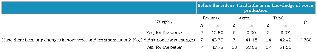 The individuals were compared in terms of having or not having prior knowledge about voice production and reporting voice and communication changes after the videos. According to Fisher's exact test, there was no significant difference (Table 2).