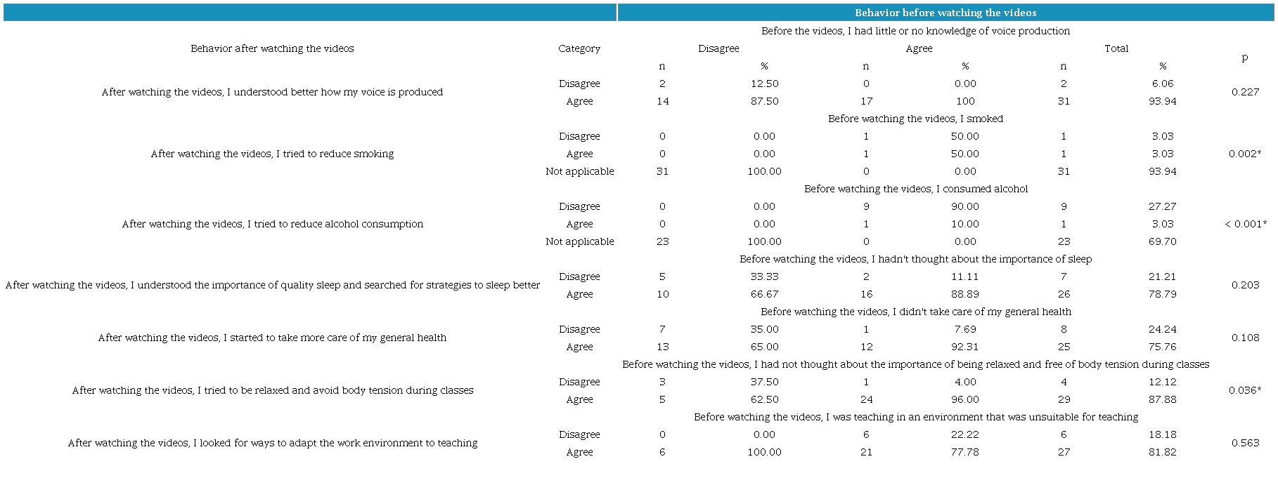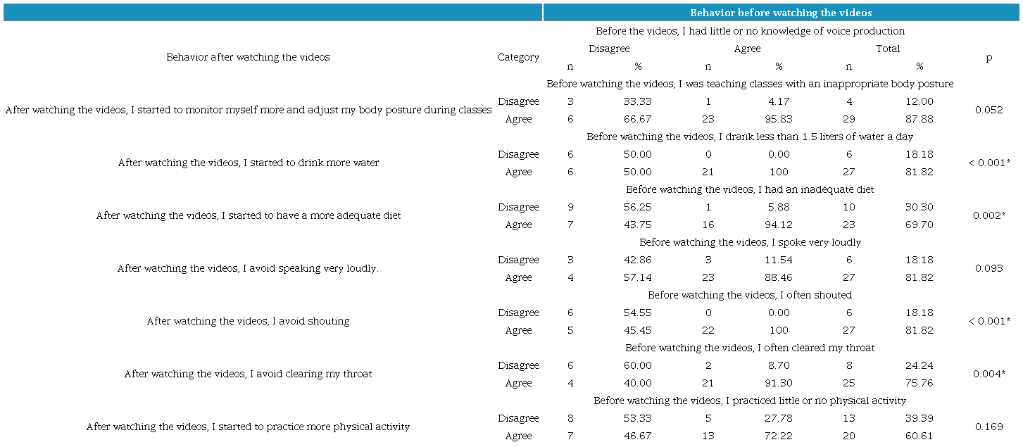 The questionnaire had statements regarding before and after viewing the videos, and the teachers were asked to indicate whether they agreed with these statements. Tables 3, 4 and 5 compare teachers regarding their behavior before and after the videos. Fisher's exact test demonstrated that they had changed behaviors such as smoking, consuming alcoholic beverages, being relaxed without body tension during classes, increasing daily water intake, having an adequate diet, and decreasing the habit of shouting and clearing their throats.