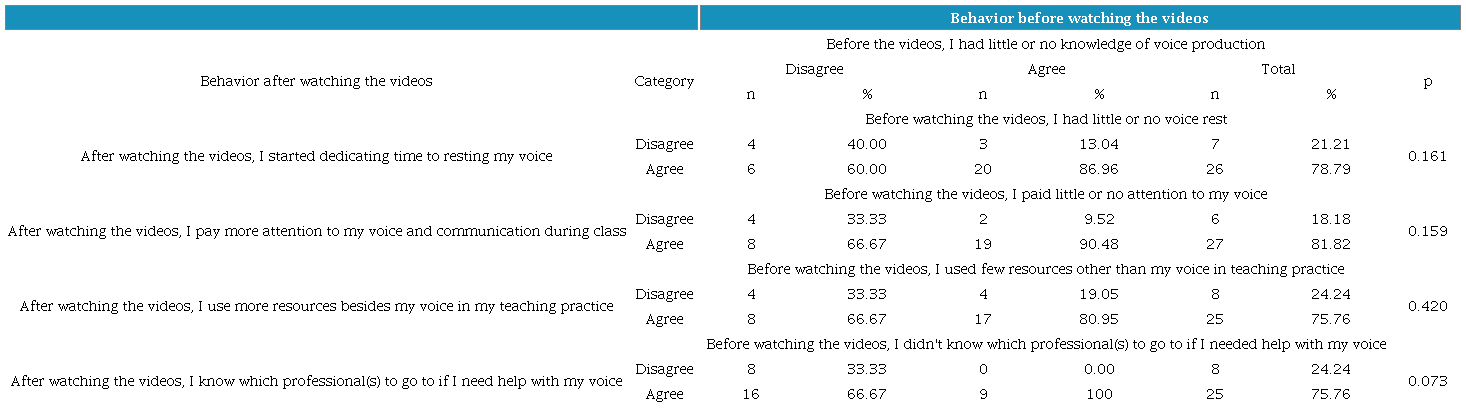 The descriptive analysis considered the measures of central tendency and dispersion. The inferential analysis assessed the association between having and not having prior knowledge about voice production and perceiving changes in voice and communication for the worse, the better, or no changes after the videos, as well as before the videos and after them. In questions whose answer options were agree, partially agree, and disagree, the researchers joined agree and partially agree into one for greater statistical analysis power, leaving only two options: agree or disagree. The Mann-Whitney U test (for ordinal qualitative variables) and Fisher's exact test (for nominal qualitative variables) were used for the inferential analysis. The statistical significance was set at 5% (p ≤ 0.05).