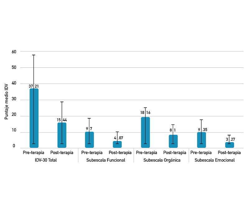 La diferencia media obtenida por los sujetos de estudio entre el IDV-10 “PRE” y “POST”terapia ([IDV-10 MEDIO “PRE” - IDV-10 MEDIO “POST”]) fue de 8.73 ± 7.71.