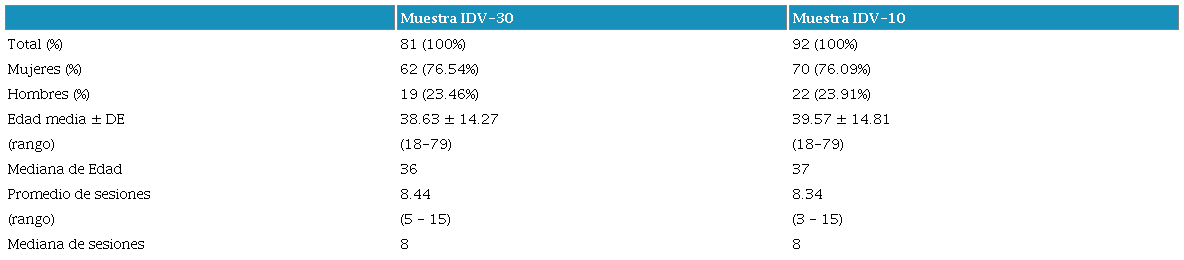 Un total de 92 sujetos disfónicos realizaron el llenado del IDV-10 “PRE” y “POST”terapia de voz. Los datos demográficos de los participantes, así como la información sobre las sesiones de terapia vocal, se detallan en la Tabla 1.