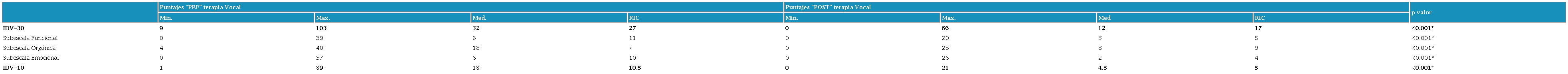 La prueba de Wilcoxon reveló que los cambios de los puntajes obtenidos en cada momento de evaluación (“PRE” y “POST”terapia vocal), tanto para el IDV-30 en su totalidad como para cada una de sus subescalas (funcional, orgánica y emocional), fueron estadísticamente significativos. Los puntajes “POST”terapia vocal fueron significativamente más bajos (lo que indica una mejora) que los puntajes iniciales (“PRE”terapia vocal).