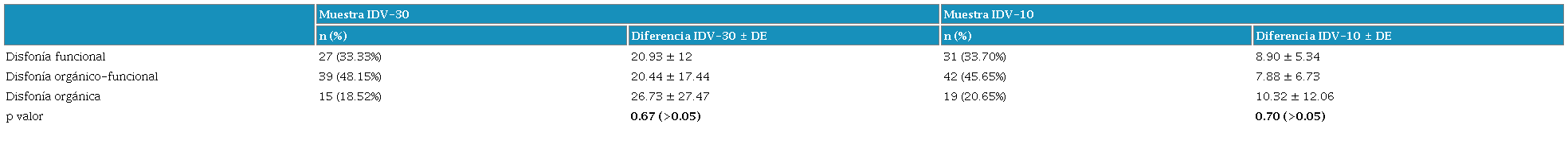 Resultados: Los participantes que completaron el IDV-30 requirieron en promedio 8.44 sesiones de terapia mientras que quienes llenaron el IDV-10 necesitaron en promedio 8.34 sesiones. Al comparar los puntajes “PRE” y “POST”terapia vocal del IDV-30 total, así como de cada una de sus subescalas y del IDV-10, la diferencia fue estadísticamente significativa (p<0.001). No hubo diferencias con significancia estadística en los cambios de los puntajes obtenidos por cada grupo diagnóstico en ninguno de los índices.