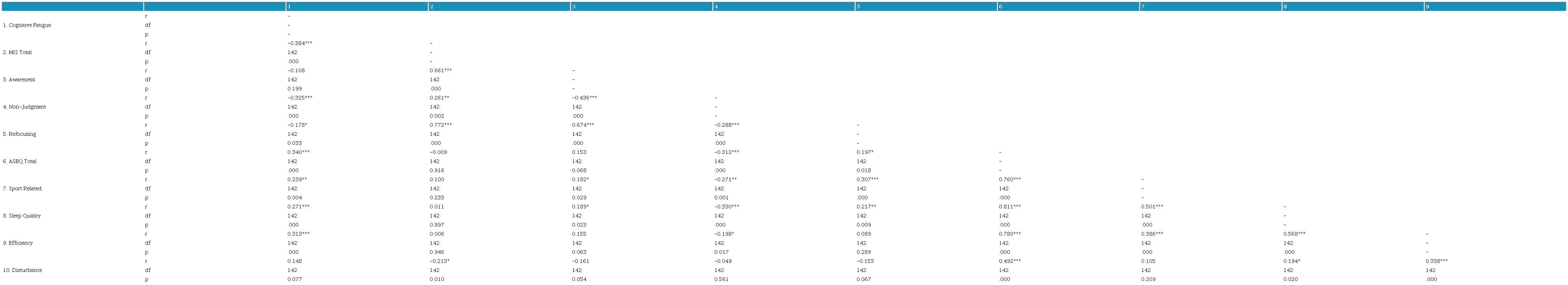 Cognitive fatigue was positively correlated with poor sleep behavior (r = 0.340; p < .001). For the subdimensions of sleep behavior, cognitive fatigue was positively correlated with sport-related factors (r = 0.239; p < .05), sleep quality (r = 0.271; p < .001), and sleep efficiency (r = 0.313; p < .001). Interestingly, no significant correlation was found between cognitive fatigue and sleep disturbance (r = 0.148; p > .05).