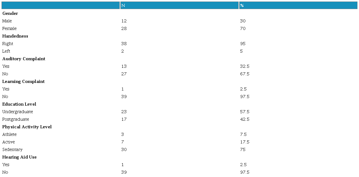 Table 1 presents participants categorized by gender, handedness, presence of auditory and learning complaints, education level, physical activity level, and hearing aid use.
