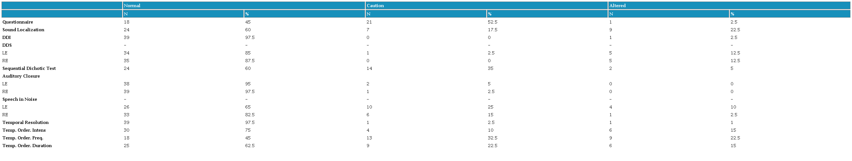 The Sound Localization and Temporal Ordering Frequency tests were frequently identified as altered (Table 2). It is known that hearing loss may negatively impact the ability to locate sounds and aspects of spatial hearing [21,22], particularly in cases of asymmetric hearing loss. Therefore, an alteration in sound location suggests a high likelihood of hearing loss, which could be due to earwax blockage or a CAP alteration at the brainstem level, specifically at the olivary complex. It's important to note that normal sound location does not rule out the possibility of hearing loss, which could be mild or asymmetrical. However, if the test fails, there is certainly a problem, either in acuity or in processing.
