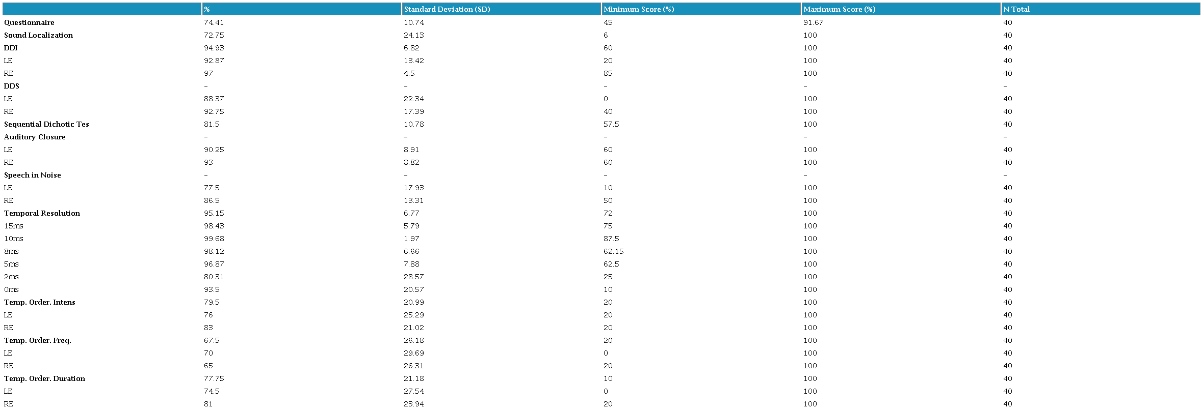 Resultados: La prueba con la mayor frecuencia de anomalías fue LS y ordenamiento temporal frecuencia (OTF), ambas con un 22.5%. En promedio, estas pruebas se consideraron como "precaución" (LS = 72.75%; OTF = 67.5%). El cuestionario de autoevaluación tuvo la mayor frecuencia de resultados de "precaución" (52.5%), seguido por PDE (35%) y OTF (32.5%). En promedio, el cuestionario de autoevaluación y OTF mostraron valores de precaución (74.41% y 67.5%, respectivamente). PDE tuvo valores promedio normales (81.5%). Ninguna prueba tuvo valores promedio anormales.