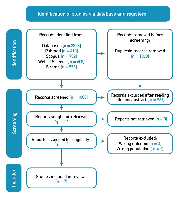 A total of 2,323 articles were identified through the database search. After eliminating duplicates, 1,000 manuscripts remained. Subsequently, they were submitted to a rigorous selection process, first by reviewing titles and abstracts, and then through full-text analysis. Finally, 7 studies were chosen for inclusion in the meta-analysis [21-27] (see Figure 1).