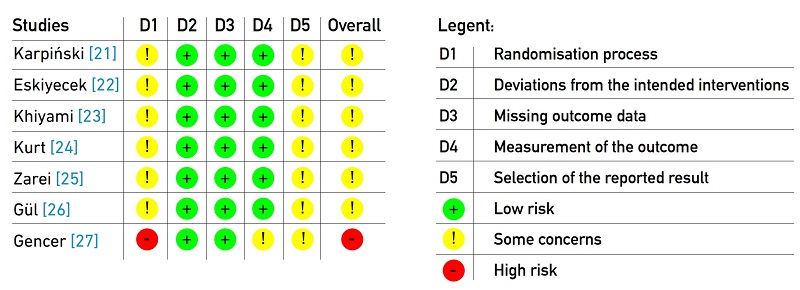 After applying the ROB 2 tool to assess the risk of bias in the included studies, all of the studies were found to have a low risk of bias in the domains “Deviations from intended interventions” and “Missing outcome data” (see Figure 2). However, concerns and a high risk of bias were identified in the domains “Randomization process” and “Selection of reported outcomes”. Figure 3 presents the detailed individual risk of bias assessment for each of the 7 included studies.