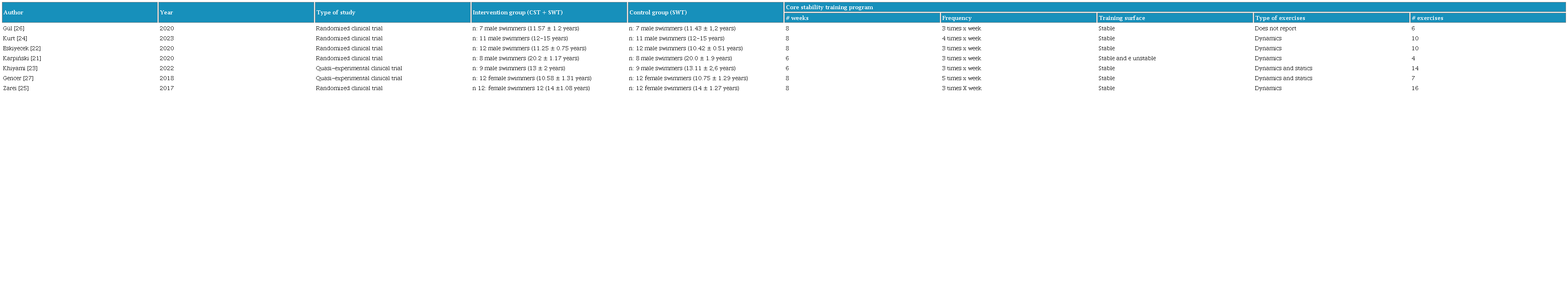 Placebo, no training, or any other physical exercise program that did not include core stability exercises nor those aimed at strengthening core musculature with the objective of improving swimming performance, were considered as comparison groups.