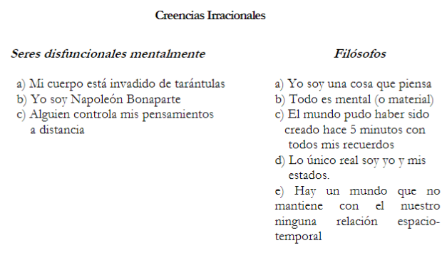 El paralelismo que en mi opinión es muy ilustrativo trazar es el paralelismo entre las creencias filosóficas, por una parte, y las creencias irracionales de los sicóticos, por la otra. Obviamente, no son idénticas, pero es innegable que comparten rasgos. Las características de estas últimas son relativamente fáciles de captar. Por ejemplo, las creencias de un esquizofrénico no son ni verificables ni refutables, nadie las acepta, no son congruentes con el cuerpo general de creencias que se tiene, son absurdas, etc. La gran diferencia con los mitos y las creencias filosóficos es que las creencias de personas que presentan disfunciones mentales son declarada o palpablemente falsas, en tanto que a las filosóficas no se les puede adscribir ningún valor de verdad. Quizá no esté de más, para justificar este paralelismo, dar algunos ejemplos de creencias de enfermos mentales y de enfermos lingüísticos, es decir, de filósofos: