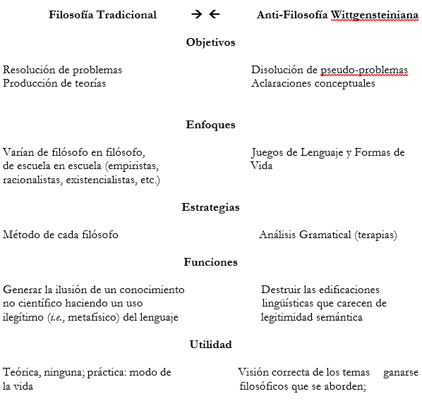 Las “terapias” filosóficas son lo que yo he llamado las ‘estrategias argumentativas’ diseñadas por Wittgenstein para enfrentar dificultades filosóficas. Quizá podamos ahora elaborar un cuadro comparativo entre la filosofía tradicional y la filosofía del análisis Gramatical o, alternativamente, la anti-filosofía wittgensteiniana. Tenemos entonces: