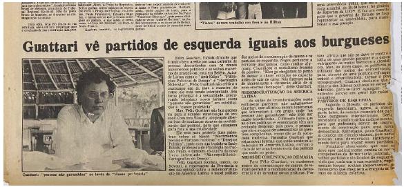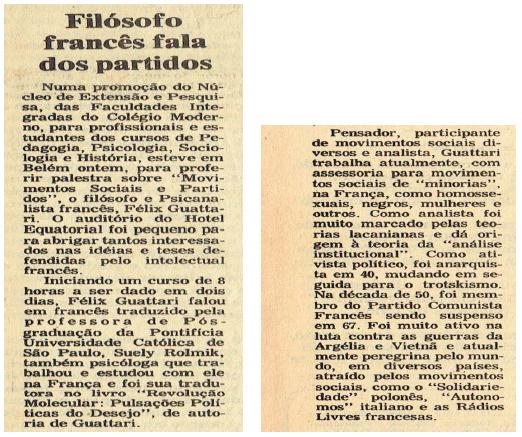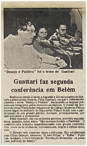 Segundo a matéria, observa-se que o evento aconteceu entre os dias 03 e 04 de setembro de 1985 e que se tratavam de duas apresentações de Guattari, cujos títulos eram: 1) “Movimentos Sociais e Partidos Políticos” e 2) “Desejo e Política”. Ambas as falas aconteceram em um evento promovido por professores das extintas Faculdades Integradas do Colégio Moderno (FICOM), sendo que ocorreram no Auditório do Equatorial Palace Hotel.