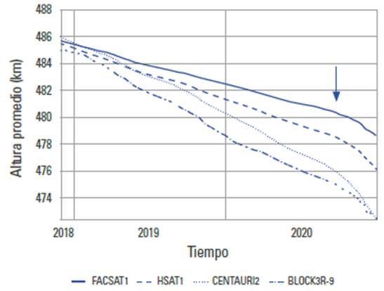 En la figura 1 se observa la evolución de la altura promedio sobre la superficie terrestre en función del tiempo tanto del FACSAT-1 como de algunos de sus compañeros que fueron puestos en órbita casi de forma simultánea. Para la realización de esa gráfica se utilizaron los Two Line Elements (TLE) (elementos de dos líneas) y la forma estándar como el Norad que expresa los elementos orbitales de los objetos que se encuentran en órbita. Entre esos compañeros se han puesto los siguientes satélites que también son CubeSats: Hsat-1, Centauri-2 y el Flock 3R-9. El primero es el más masivo (13 kg), ya que se trata de un satélite integrado por 6U; los restantes están conformados por 3U, como el FACSAT-1, cuyas masas también oscilan entre 4 y 5 kg.