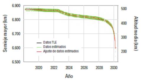 Para realizar el análisis de vida útil del satélite FACSAT-1 se usó el histórico de los TLE, pues al ser datos públicos son de fácil acceso. Sin embargo, es esencial complementar con datos de las estaciones de monitoreo (obtenidos por el operador del satélite) para mejorar la precisión de los algoritmos y de las predicciones. Hay que tener en cuenta que los TLE presentan errores generados por la baja precisión del modelo de perturbaciones, falta de información sobre la actitud del satélite, sus propiedades específicas: masa, materiales, dimensiones y, ruidos y bias de la señal, entre otros (Xu & Xiong, 2018; Levit & Marshall, 2011; Vallado & Cefola, 2012; Lee, 2002). Aun así, los datos obtenidos a partir de los TLE sirven para generar una predicción aceptable de la posición del satélite en los próximos tres días al último reporte de TLE, siempre y cuando se implementen en un modelo simplificado de perturbaciones tal como el SGP44.